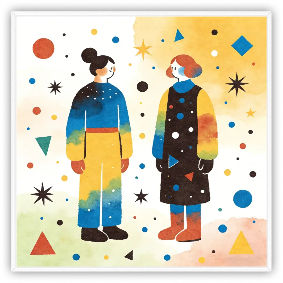 当我们对望时,各自身上的宇宙开始共振——那些藏在衣纹里的星芒、色块,是我们没说出口的,独属于彼此的暗语。